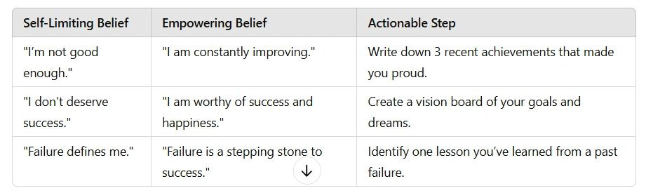 🔹 Example: If you think you can’t learn a new skill, sign up for a beginner-level class and commit to one lesson.